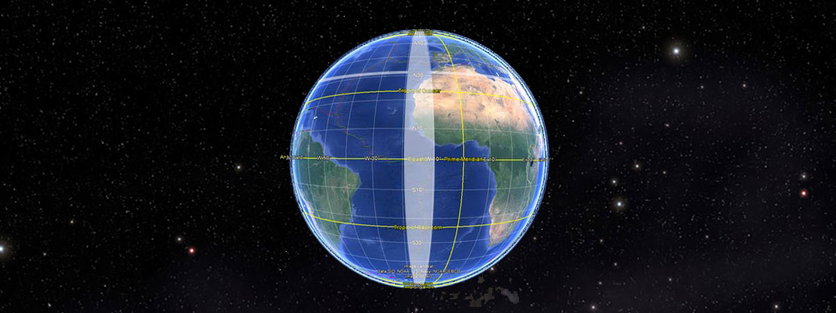I sat down and began my prayers. Under the Planetary Day Moon, and the Planetary Hour Sun, I asked that the Creator cleanse and send out love to all of the areas of Mother Earth highlighted in the following image, this time between the latitudes W20° and W10°, all the way from the North Pole, down to the South Pole: