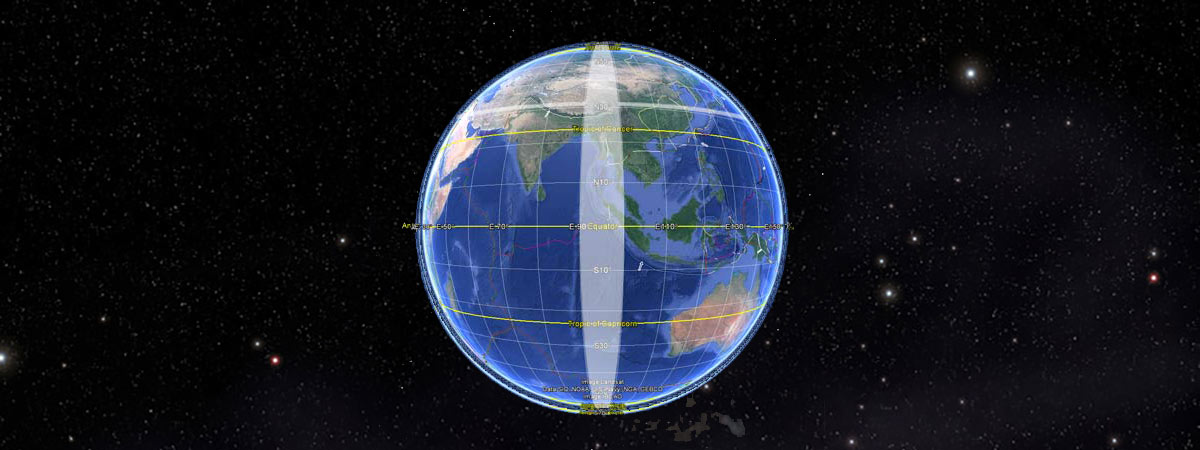 And performed my ritual. I asked that the Creator cleanse and send out love to all of the areas of Mother Earth highlighted in the following image, this time between the latitudes E90° and E100°, all the way from the North Pole down to the South Pole: