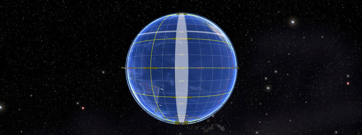 Under the Planetary Day Mars, and the Planetary Hour Moon, I asked that the Creator cleanse and send out love to all of the areas of Mother Earth highlighted in the following image, this time between the latitudes W160° and W150°, all the way from the North Pole down to the South Pole: