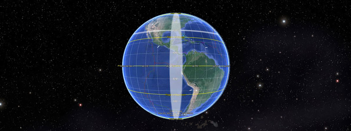 Once again, I asked that the Creator spread love to all of the areas of Mother Earth highlighted in the following image, this time between the latitudes W90° and W80°, all the way from the North Pole down to the South Pole: