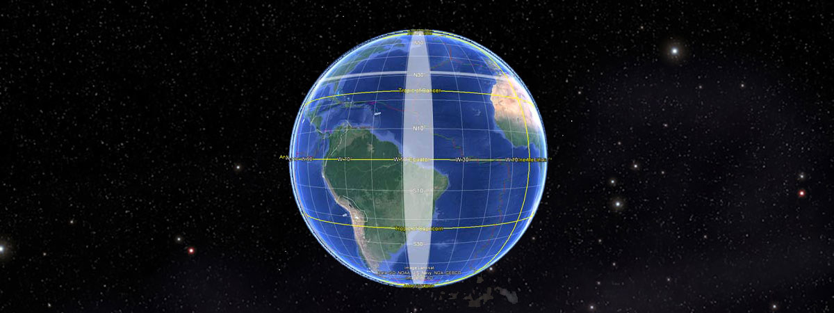 I began praying under the Planetary Day Venus and the Planetary Hour Jupiter. I asked that the Creator cleanse and send out love to all of the areas of Mother Earth highlighted in the following image, this time between the latitudes W50° and W40°, all the way from the North Pole down to the South Pole: